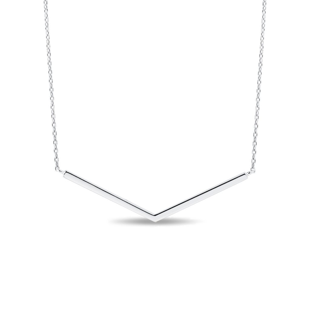Die moderne Halskette aus 14 kt Weißgold besteht aus einer zarten, 45 cm langen Ankerkette mit einem fest angebrachten Anhänger in Form eines glatten V-förmigen Stabes. Dank klarer Linien und präziser Verarbeitung wirkt der Schmuck leicht und elegant. Er kann einzeln getragen oder problemlos mit anderen Halsketten kombiniert werden, um einen mehrschichtigen und einzigartigen Look zu kreieren.