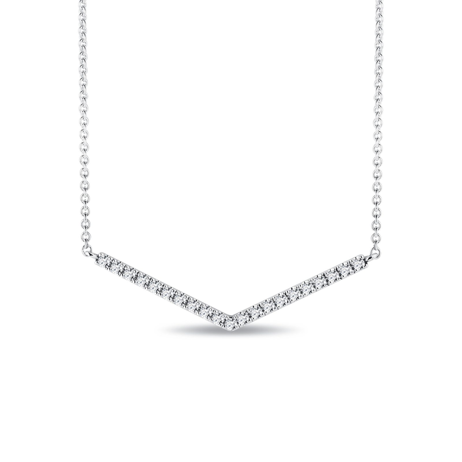 Diese elegante Halskette aus 14 kt Weißgold kombiniert eine zarte, 45 cm lange Ankerkette mit einem geometrischen V-förmigen Anhänger, der mit winzigen Diamanten verziert ist. Dank der klaren Linien und der präzisen Verarbeitung wirkt der Schmuck modern und lässig. Er kann einzeln oder in Kombination mit anderen Halsketten getragen werden und bleibt dennoch ein auffälliges, minimalistisches Accessoire.