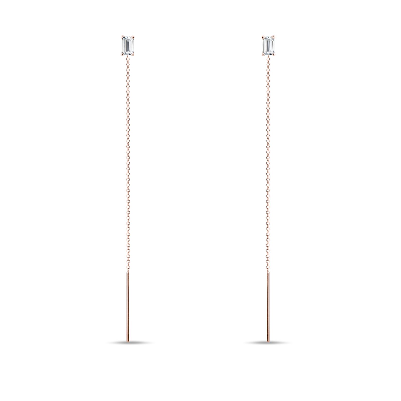 Hängende Ohrringe aus 14 kt Roségold, verziert mit im Labor gezüchteten Diamanten im Smaragdschliff. Die Ketten können jederzeit abgenommen werden, so dass Sie die Ohrringe 2in1 als Anhänger oder als zarte Ohrstecker tragen können. Ein zeitloses Schmuckstück, das bei jeder Gelegenheit auffällt.