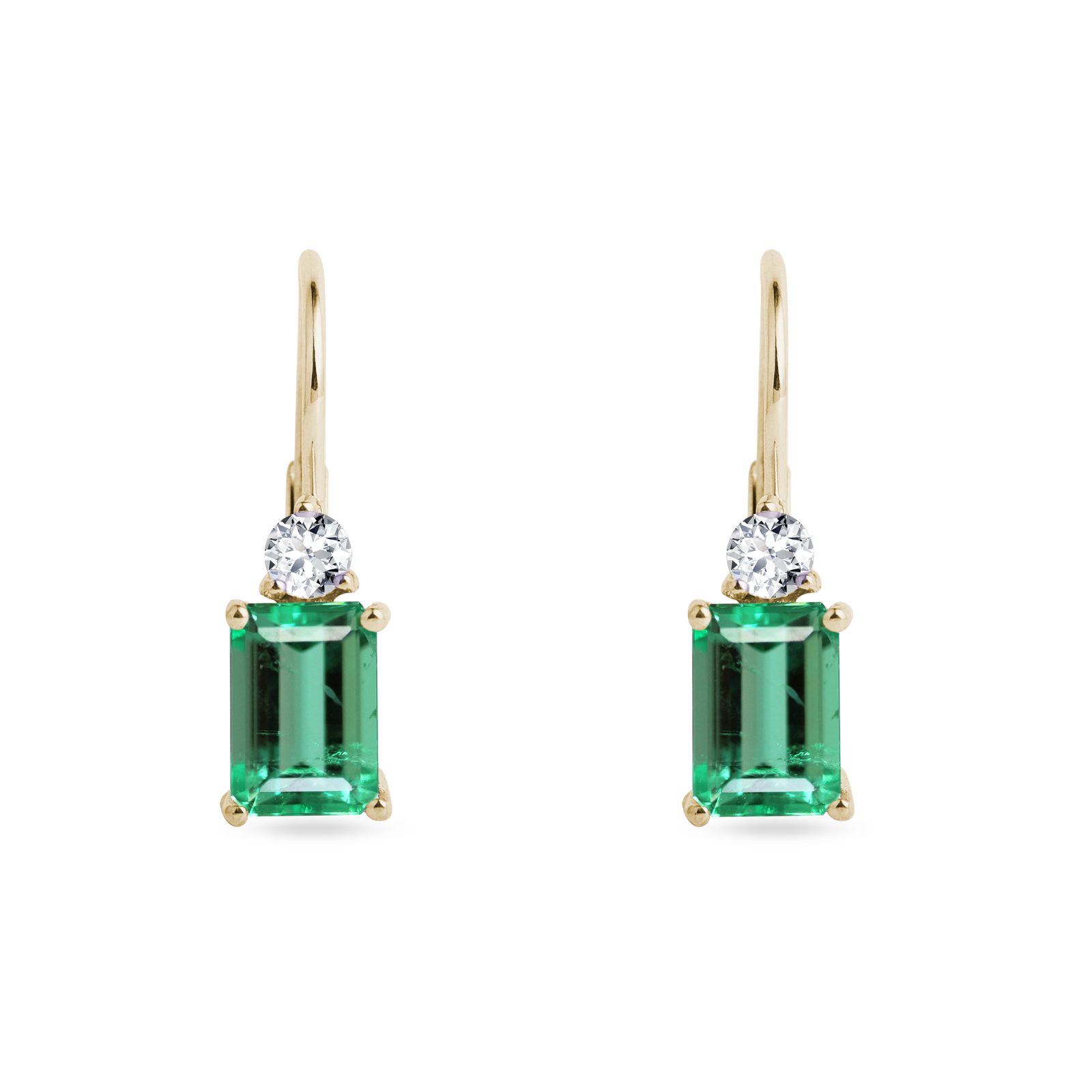 Luxuriöse Ohrringe aus 14 kt Gelbgold, verziert mit markanten Smaragden im Smaragdschliff, ergänzt durch funkelnde klare Diamanten. Ein wirklich außergewöhnliches Schmuckstück, das durch seine schöne Farbkombination und raffinierte Verarbeitung besticht. Die Ohrringe werden mit einem Damenverschluss verschlossen.