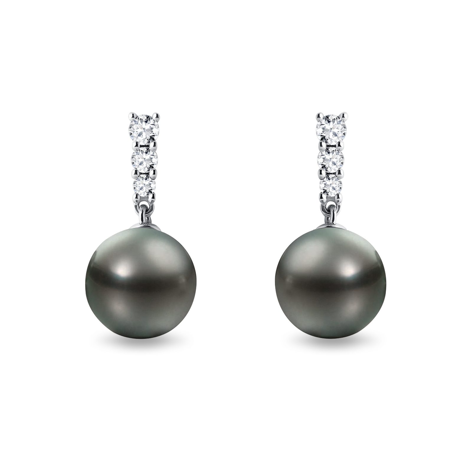 Elegante Ohrringe mit natürlichen Tahitiperlen, die in Kombination mit Weißgold wunderschön zur Geltung kommen. Jeder Ohrring wird durch drei klare Diamanten im Brillantschliff ergänzt, die dem gesamten Schmuckstück ein subtiles Funkeln verleihen. Ein wunderschönes Schmuckstück, das Frauen, die ein originelles und elegantes Design schätzen, verzaubern wird.