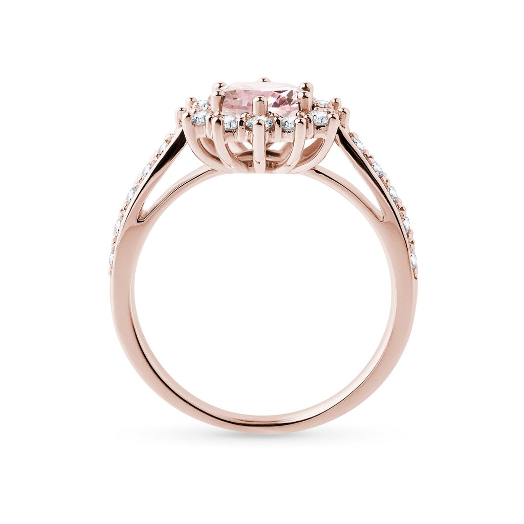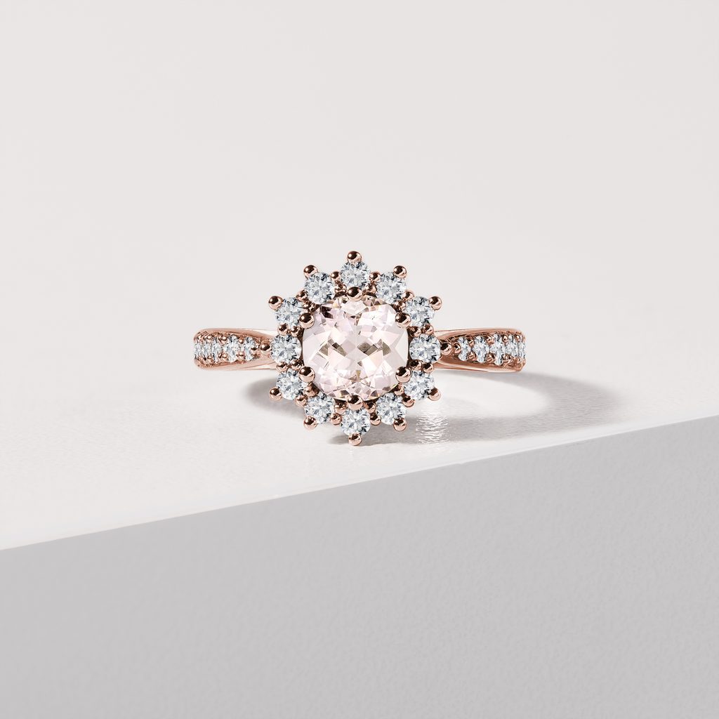 Ein atemberaubender Ring aus 14 kt Roségold ist mit einem runden Morganit in zartem besetzt, der von rundgeschliffenen und klaren Diamanten umrahmt wird. Die Kombination aus der frischen Farbe des zentralen Edelsteins und dem Funkeln der Diamanten wirkt leicht und zeitlos. Der Ring wird Frauen begeistern, die eleganten und unverwechselbaren Schmuck mit einem dezenten Farbakzent suchen.