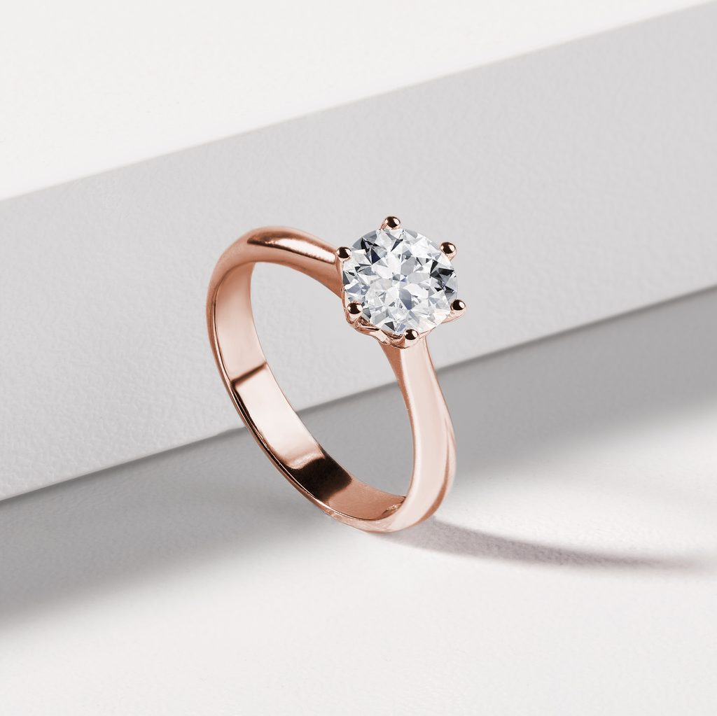 Klassischer Luxusring aus 14 kt Roségold, verziert mit einem unübersehbaren 1 ct Naturdiamanten im Brillantschliff. Eine perfekt ausgearbeitete Fassung in sechs runden Zacken lässt den zentralen Stein in seiner ganzen Pracht erstrahlen. Ein großartiger Verlobungsring für Frauen, die kühne und schillernde Schmuckstücke bevorzugen. Sie erhalten ein internationales gemmologisches Laborzertifikat mit Ihrem Schmuckstück.