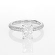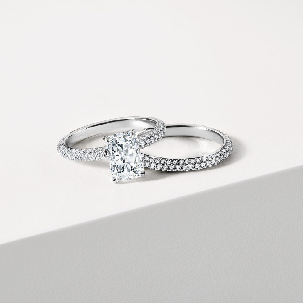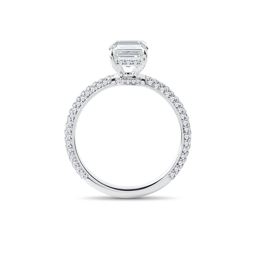 Der Ring aus 14 kt Weißgold ist mit einem im Labor gezüchteten Diamanten von 1,60 ct im rechteckigen Radiantschliff besetzt. Die Fassung ist mit kleinen, klaren Diamanten in mehreren Reihen rundum verziert, wodurch der Ring bei jeder Bewegung funkelt. Die elegante Kombination aus einem markanten Solitär und einer zart verzierten Fassung macht ihn zur idealen Wahl für Verlobungen und besondere Momente im Leben.