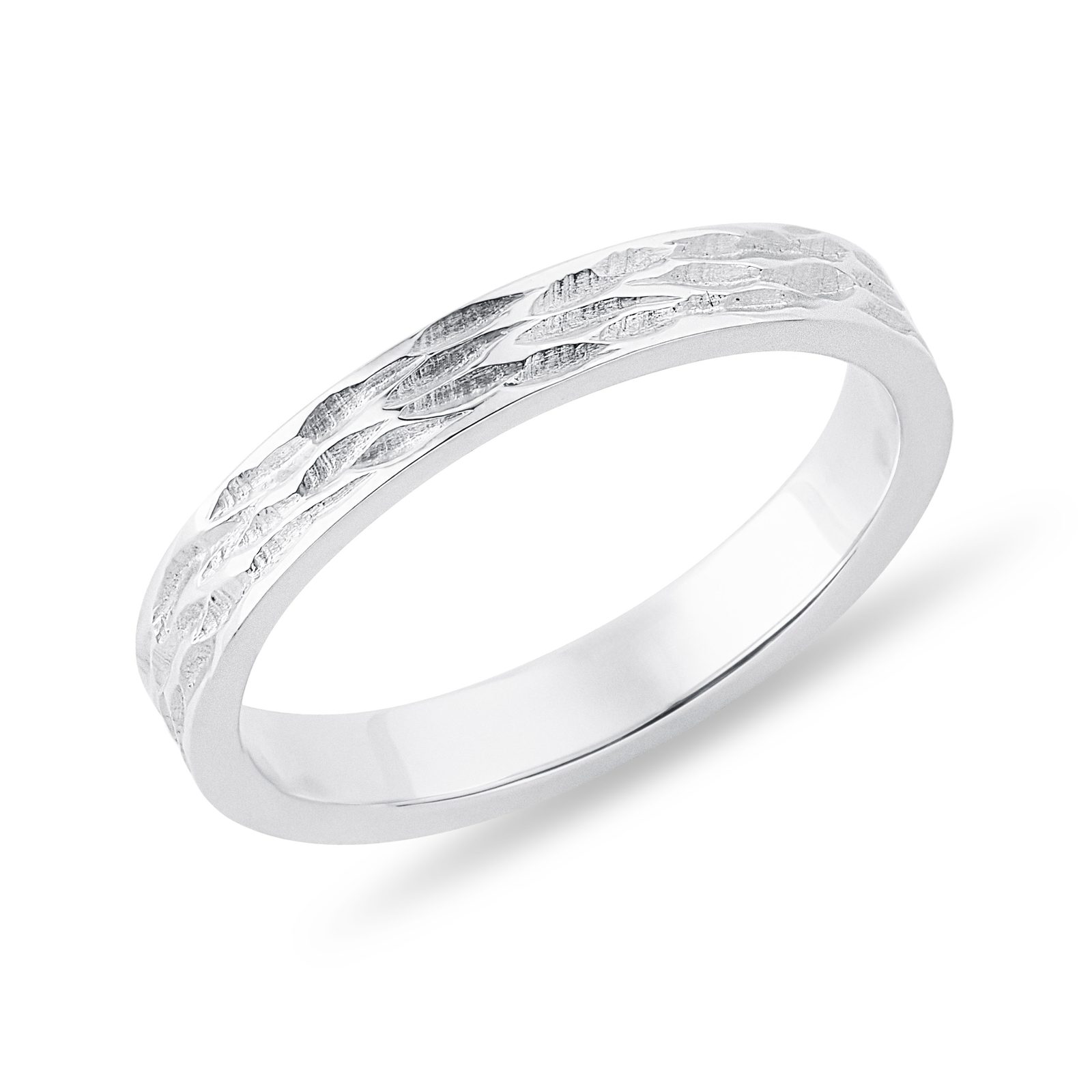 Außergewöhnlicher Ehering aus 14kt Weißgold. Die Ringoberfläche ist mit einer unregelmäßigen Handgravur verziert – so entsteht ein absolut einzigartiges und modernes Design.