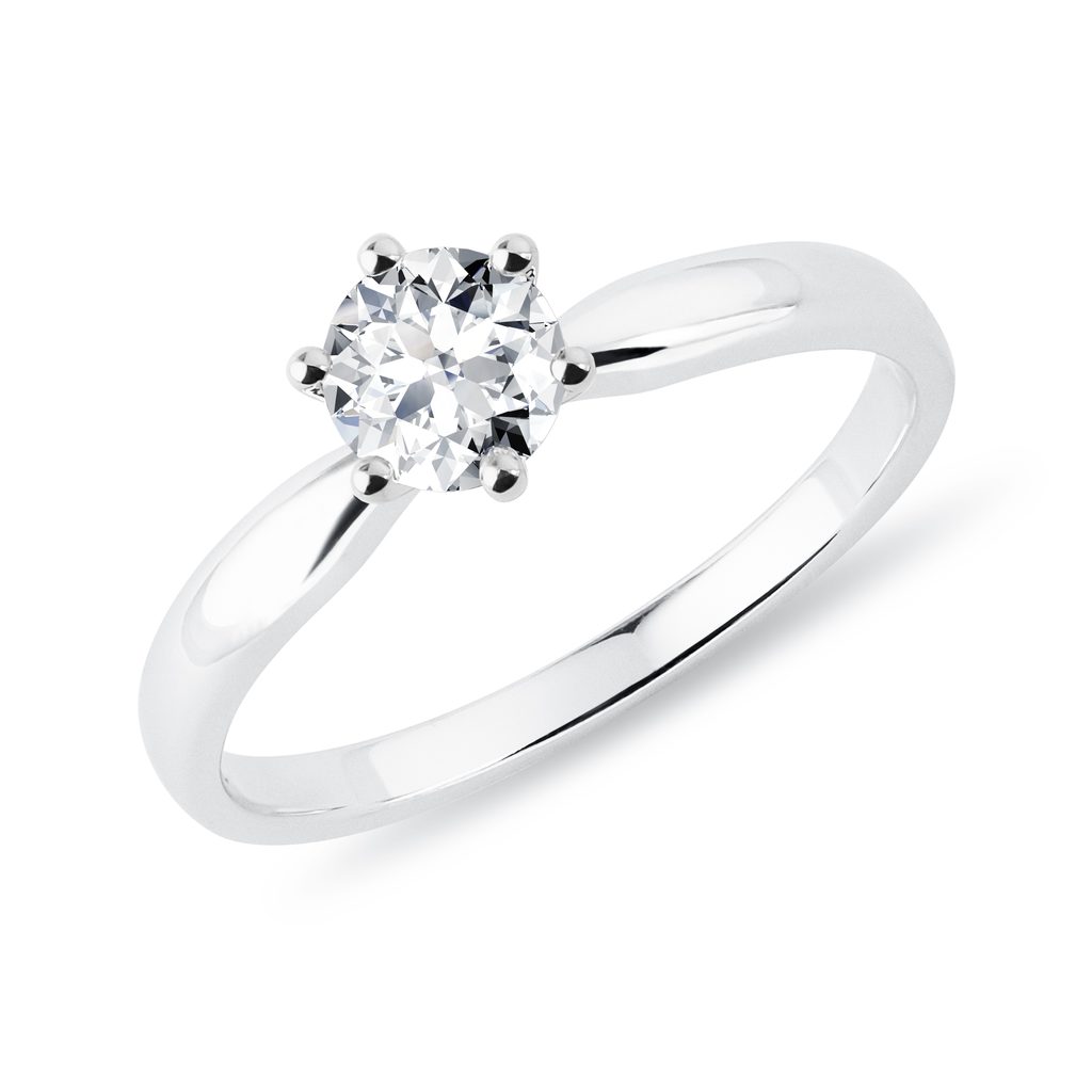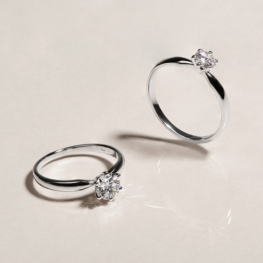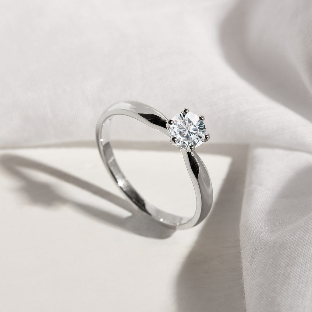 Ein luxuriöser Verlobungsring von zeitloser Eleganz. Der Ring aus 14 kt Weißgold ist mit einem 0,5 ct großen Brillanten besetzt, der in einer traditionellen Sechs-Krappen-Fassung gefasst ist, die sein Funkeln optimal zur Geltung bringt. Zeitlose Handwerkskunst und hochwertige Materialien machen ihn zur idealen Wahl für einen besonderen Moment wie einen Heiratsantrag und zu einem Schmuckstück, das Sie ein Leben lang begleiten wird.